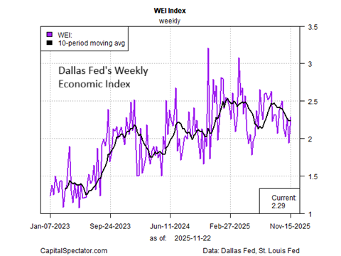 Using the Dallas Fed’s Weekly Economic Index (WEI) as a guide highlights a clear downshift, based on data through Nov. 15. The current estimate indicates four-quarter GDP growth at 2.3%, up slightly from Q2’s 2.1%. The trend has softened recently for WEI estimates, but recession risk remains low by this measure.