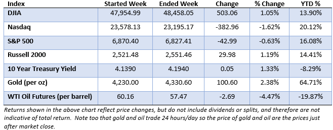 Most segments of the U.S. stock market delivered mixed results this week following the Federal Reserve’s quarter-point interest-rate cut, discussed below. Investors generally interpreted the decision as supportive without signaling immediate economic stress. The Dow Jones Industrial Average and the S&P 500 traded near recent highs, and small-cap stocks also participated, with the Russell 2000 finishing the week in the black.
