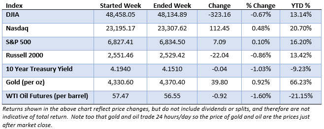 Taken together, last week’s trading suggests that Mr. Market is paying a bit less attention to the promise of AI and a bit more attention to the broader economic backdrop. Whether that shift proves lasting may depend on whether recent inflation data reflects genuine cooling or temporary distortions tied to the government shutdown.