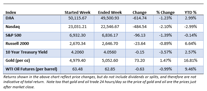 The rotation out of high-fee, labor-intensive business models viewed as potentially vulnerable to AI-driven disruption continued this week. Commercial real estate, tax planning, and wealth management firms were among those caught up in the so-called “AI Scare Trade.” Meanwhile, old-economy value stocks have come back into favor as investors pivot toward companies with tangible earnings, durable cash flows, and less exposure to automation-driven disruption.