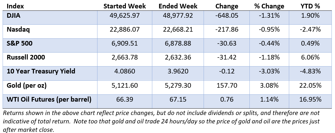 AI disruption fears alongside fresh inflation data led to a choppy week on Wall Street. Select earnings reports and data suggesting the American consumer remains resilient, provided some support. However, those positives were more than offset by concerns about AI disruption (discussed below) leaving broader indexes struggling to gain sustained traction.