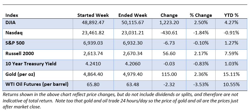 Equity markets navigated a volatile week to end roughly flat, as the Dow climbed to a record 50,000 while growth-oriented equities bore the brunt of the pullback. Technology stocks were especially hard hit as earnings reports from several AI-related companies outlined aggressive investment plans, leaving analysts and investors questioning if and when those massive expenditures will translate into sustainable earnings growth.