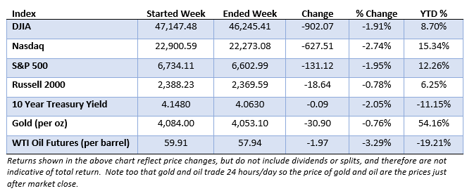 Stocks retreated this week as profit taking and uncertainty about the direction of interest rates left the major market indexes in the red. Early optimism faded as investors took a harder look at the year’s biggest winners, particularly those who have benefited most from the AI frenzy. Traders appeared anxious to pull some of their chips off the table as valuation worries grew and questions mounted about whether the push to build AI scale is draining too much capital from corporate balance sheets.