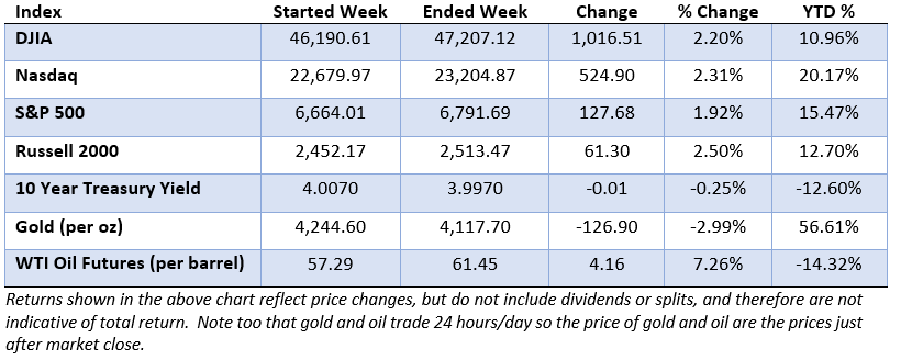 Stocks extended their gains this week as earnings reports came in largely positive and the limited flow of data, constrained by the government shutdown, pointed to continued but modest economic growth and contained inflation. Still, recent reports showed that U.S. activity has slowed in several regions, with softer consumer spending and a rise in layoffs. The mix of good and bad news has kept both bulls and bears in check for now.